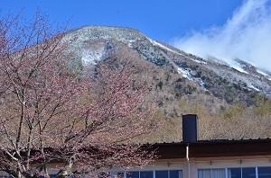うっすらと雪化粧の男体山とつぼみがふくらんできた山桜,そして職員室から見えるヤシオツツジ,中宮祠小中学校の美しい風景です。