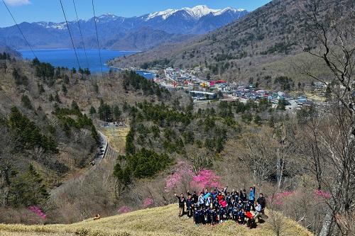 学校を徒歩で出発し、明智トンネル脇で小休止をしたあと、一気に鉄塔広場に登りました。美しいピンクに染まるアカヤシオ越しの風景は、絶景中の絶景です。男体山、中禅寺湖、華厳の滝、そして中宮祠の街並み上方には、我が中宮祠小中学校があります!。