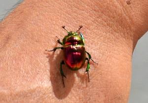 オオセンチコガネムシです。学校に庭で見つけました。糞虫(ふんちゅう)の仲間でとても美しい光沢をもった昆虫です。自然の中ではとても重要な役割を持っており,動物のフンを土に帰すのを手伝ってくれるそうです。そういえば前回のシカと同じ所で見つけました。(この手は校長先生です・・・)