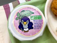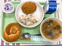 米粉パン、牛乳、県産豚肉コロッケ、かんぴょうサラダ、にらのピリからスープ、県民の日マスコット「ルリちゃん」付き県民の日デザート
