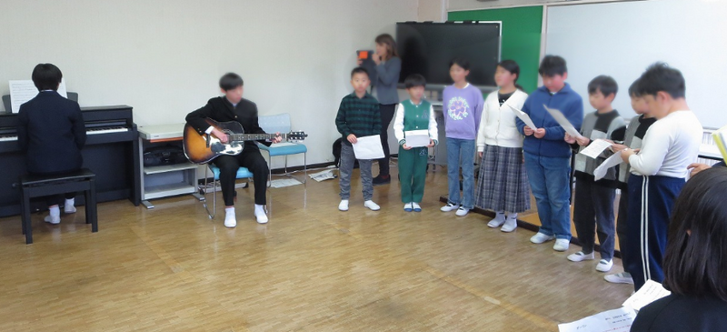 最後に、転出する児童とのお別れ会がありました。次の学校でも「自分らしく輝くように」と思いを込めて、全校児童生徒で合唱しました。伴奏は、中学生の演奏するギターとピアノです。短時間でしたが一生懸命に練習し、素晴らしい合唱となりました。全校児童生徒・教職員ともに心温まる時間となりました。