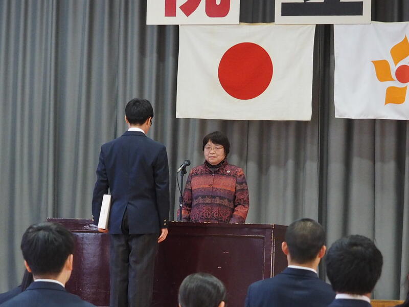 校長からは、入学してから大きく成長した2年生の事や2050年問題を受けてこれからどう行動していってほしいかについて話がありました。堀川様よりお祝いのお言葉をいただき、今年がミラノコルティナオリンピックの年で本県から出場する選手は皆さんと近い年齢であり、個々に目標をもって努力することの大切さについてお話をいただきました。