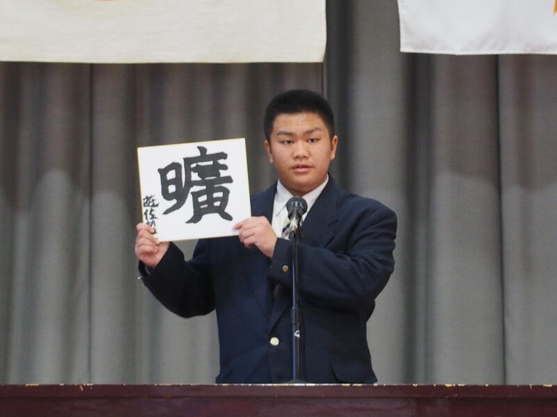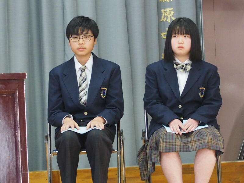 2年生一人一人が壇上で決意の一文字発表を行ったり、3名の生徒による作文発表、学年合唱(HEIWAの鐘と校歌)を歌ったりしました。