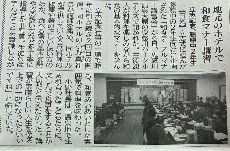 6日は、鬼怒川パークホテルズで昨年に引き続き、和食のテーブルマナー教室を行いました。社長である小野真様が講師を務めてくださり、会席料理とは、基本姿勢、箸のマナー、メニュー等わかりやすく教えていただきました。