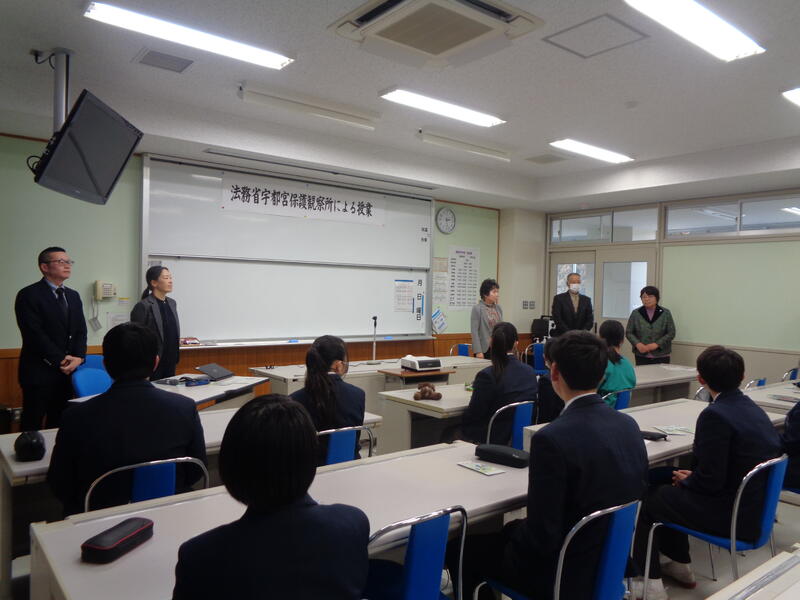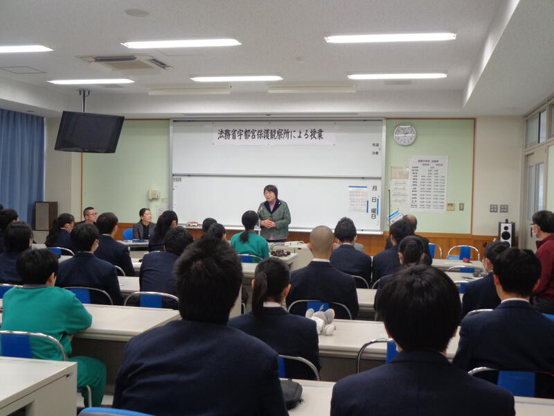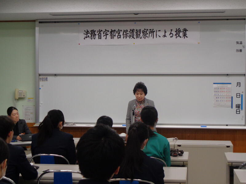 2月13日(金)法務省宇都宮保護観察所の方々より3年生に向けて特別授業をしていただきました。日頃、犯罪等で服役し、その後社会に出て就労したりする人々に対して、深い関わりを持ってくださってくださっている方々からのお話は、私たちの想像したことのない内容でした。貴重なお話を聴く機会を得て、これから現在よりもまた広い社会へ旅立つ3年生にとって、心に残る授業となりました。ありがとうございました。
