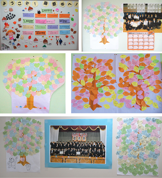 美術部の活動の一環で、毎月の予定を昇降口に掲示しています。また、霜月祭でのがんばりを称賛する「がんばったねの木」を各学年のフロアに掲示しています。これは、本校のパイロット校の研究や目指す学校像「感謝と称賛にあふれる学校」にもつながるものです。
