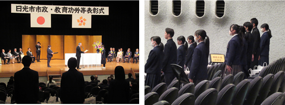 11月23日(木)、今市文化会館で日光市教育功労等表彰式が行われました。本校からは各種大会で優秀な成績を収めた特別表彰と模範児童・生徒表彰により3名の生徒が受賞しました。また、高校の大会で優秀な成績を収めた卒業生も受賞しました。受賞されたみなさん大変おめでとうございます。さらなる活躍を期待いたします。