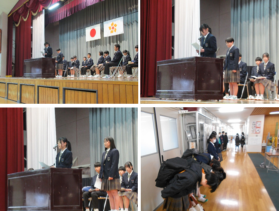 12月11日(月)、生徒会役員選挙立会演説会を行いました。立候補者は、それぞれ学校生活をよりよくするための考えや公約を堂々と述べました。コロナ禍の制限が緩和されことを機に、これまで以上に生徒が主体となって学校生活を充実させていってほしいです。現生徒会では、毎朝昇降口であいさつ運動や定期的に地域のゴミ拾いを行っています。このような日常の取組が学校生活の充実につながると思います。