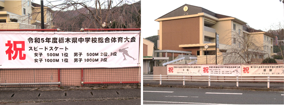 12月13日(水)、先に行われた県総合体育大会スピードスケート大会の活躍を称賛して、横断幕を設置しました。