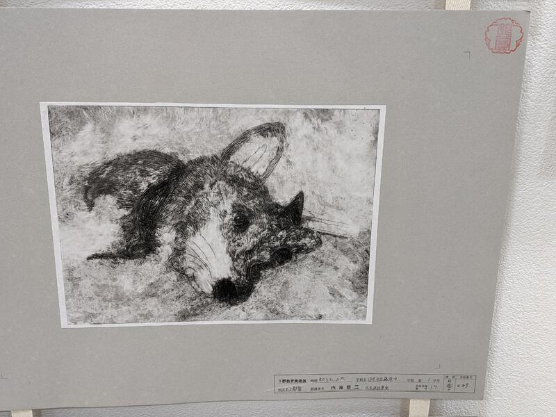 下野教育美術展で、本校から4名の生徒の作品が入賞しました。1年生 武田真実さん 銀賞:版画「知りあいの犬」、