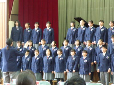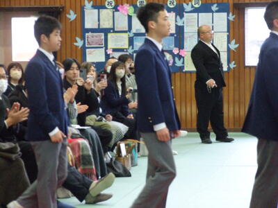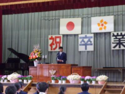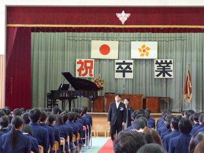 卒業証書を受け取る時の緊張した面持ち、思いの丈を込めた卒業生答辞、感謝の気持ちが心に響いた合唱、一つ一つに卒業生の成長した姿を感じることができました。校長式辞では、2つのメッセージ「失敗を恐れず、チャレンジすること」「ゴール(目標達成)イメージを明確にすること」を送りました。卒業生答辞では、中学校の思い出やお世話になった保護者や先生方への感謝の気持ち、在校生への励ましの言葉などが述べられました。式後に卒業生合唱「僕のこと」が心を込めて歌われ、感動の心温まる式となりました。卒業生の皆さん、保護者の皆様、ご卒業おめでとうございます。卒業生の今後の活躍を期待しています。