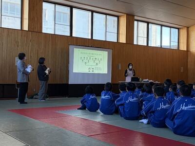 12月11日、助産師さんをお招きし、「命の尊さ」をテーマにした講演会が行われました。講演では、思春期になると心と体が大人へと変化していくことや、赤ちゃんがお腹の中で育つしくみについて分かりやすく教えていただきました。生徒たちは、妊婦さんのお腹の重さを体験できる“妊婦ジャケット”を着用したり、赤ちゃん人形を抱っこしたりと、普段はできない体験を通して命の重みを感じていました。「赤ちゃんを抱くのが思ったより難しい。」、「妊婦さんってすごい。」といった声が上がるなど、命について深く考えるきっかけとなる貴重な時間となりました。(記事担当:広報委員)