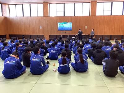 12月8日(月)放課後に生徒集会を行いました。人権週間にちなんだ活動を担当教員が行った後、福祉委員会がペットボトルキャップの回収と赤い羽募金について呼びかけました。何のために募金が使われるか等、わかりやすく説明がありました。その後、放送委員や選挙管理委員会からのお知らせがあり、生徒はよく話しを聞いていました。