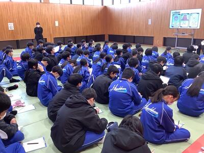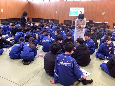 12月11日(木)6校時、2年生で「ココロカラダ教室~生まれてきてありがとう~」と題した親子講演会を行いました。助産師さんから思春期の体と心の変化についてお話を聞いた後、赤ちゃん人形を抱っこしたり、妊婦体験を行ったりしました。いのちの大切さをしっかり考えた時間となりました。