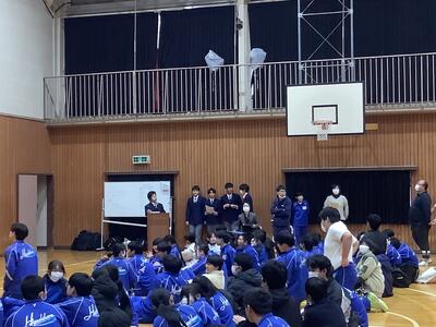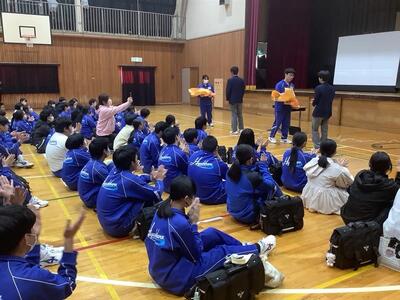 2月26日(木)、生徒会主催の「3年生を送る会」が映画鑑賞と感謝の会の内容で行われました。映画「HACHI 約束の犬」を感染症対策で分かれて鑑賞した後、体育館に移動し、各クラスで作成した感謝の動画を上映しました。どのクラスも3年生への感謝の気持ちをしっかり伝えようと、趣向を凝らして作成されていました。花束贈呈や3年生代表あいさつもあり、心温まる時間となりました。