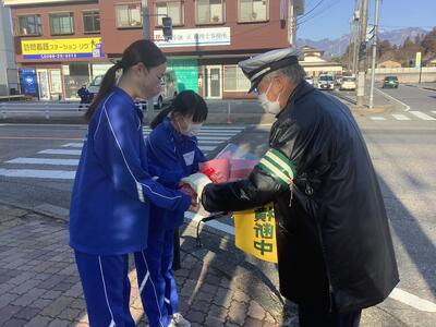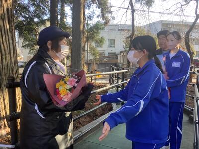 3月2日(月)、毎朝お世話になっている交通指導員さんへ、御礼の花束贈呈を卒業を迎える3年生の代表生徒が行いました。生徒が安全に登校できるよう、毎朝欠かさず道路の清掃や誘導をしてくださり、本当にありがとうございます。引き続きよろしくお願いします。