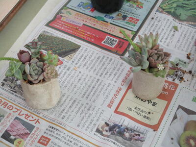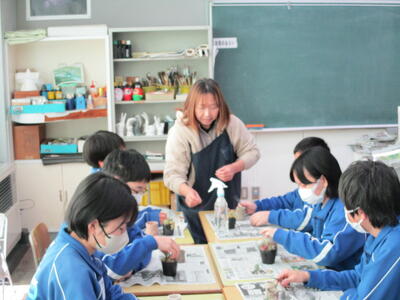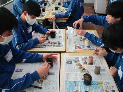 2月4日(水)2年美術の授業で、多肉クラフトマスターの沼田典子先生をお招きして、多肉寄せ植え教室を実施しました。手作りの小さなかわいい鉢に、ピンセットで多肉植物を寄せ植えしました。それぞれに工夫したすてきな寄せ植えができました。