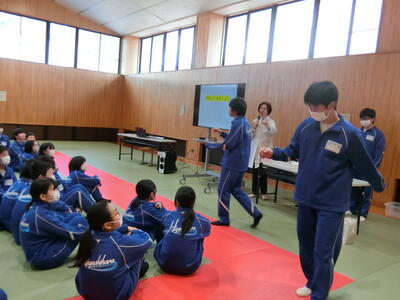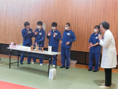 医薬品の適正利用や違法薬物の危険性、飲酒による心身の影響について、スライドや実験を通してわかりやすく教えていただきました。生徒からは「今までは医薬品を適正に使うことの大切さを知らなかったけれど、実験や講話を聞いてどうして適正に使わなければならないか、その理由がよくわかりました。」等の感想がありました。