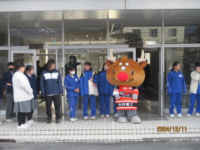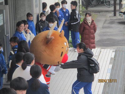 「あいさつとマナーのよい学校」の実現に向け、生徒会各委員会で、登校時の「あいさつ運動」を行っています。この日は、その活動に日光アイスバックスの協力と応援が加わりました。