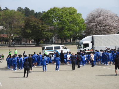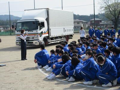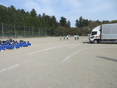 4月22日(火)、校庭において交通安全・防犯教室を行いました。講師として日光市役所生活安全課・日光市トラック協会の皆様をお招きし、講話を聞いたり実演を見たりして交通安全とSNS等の防犯について学びました。