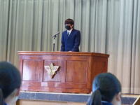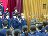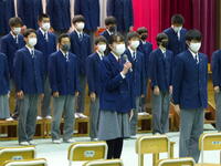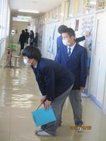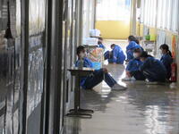 ・校舎内での移動中に緊急放送が入り、放送の指示があるまで待つ様子