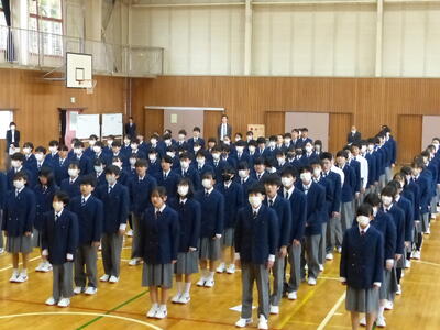 3年生69名が卒業を迎え、在校生、教職員、保護者、地域の方々に見守られ、中学校を巣立っていきました。