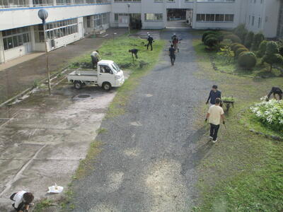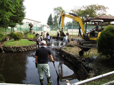校庭や中庭の除草、校内外トイレ清掃、さらには数年ぶりに池の水を抜いての池清掃を行いました。