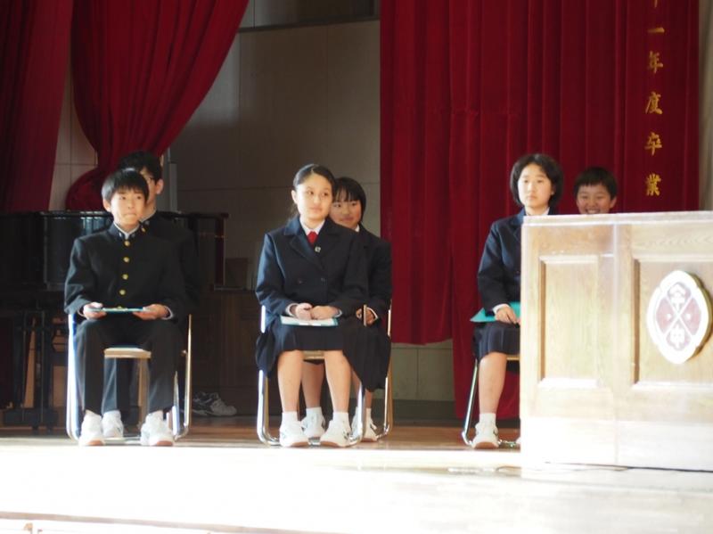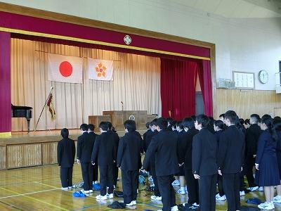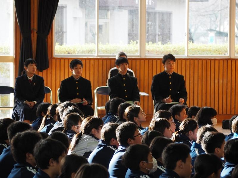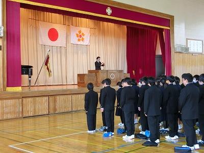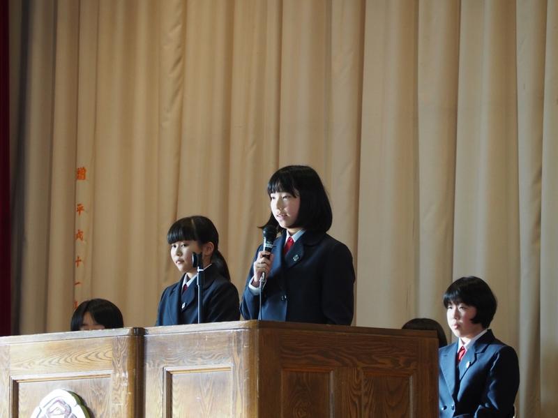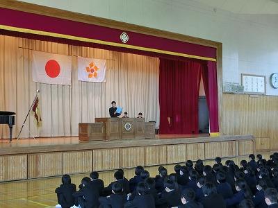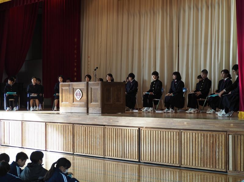 12月25日、第2学期の終業式が行われました。君が代斉唱に引き続いて、各学年から代表生徒による、2学期の振り返りと今後の抱負が発表されました。3名の発表からは、これまでの活動の充実ぶりとともに、自己の課題を見出し今後に生かそうとする意欲を感じました。