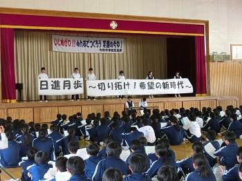 生徒会役員から今年度のスローガン「日進月歩 ~切り拓け希望の新時代~」が発表され、令和元年度、今市中学校生徒会が本格的なスタートを切りました。