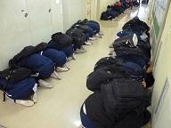はじめに,体育館にて竜巻時における,より安全な場所の確認と避難時の姿勢を学びました。次に,教室にいったん戻り,実際に避難する場所の確認を行いました。