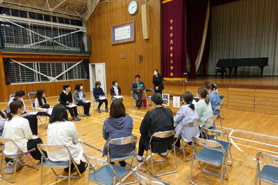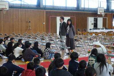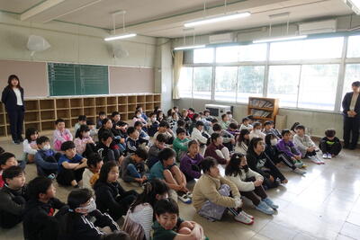 公演後は「スマイル・スマイル」の方から、今小の校歌の歌詞「二荒の高嶺 幸の湖」はこの神話からきているものとの話がありました。これから校歌を歌う際にはきっと今日の人形劇を思い出すことと思います。