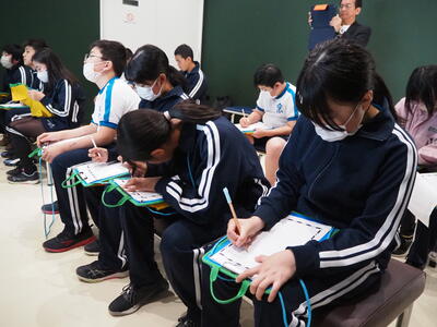 2時間目は、実際に工場で行われる作業やトレーニングを体験したり、使われている保護具を身に付けたりしました。ボルト締付けでは工場で使われている電動工具を使い、マスキング体験では実際の車の部品を用いて色の塗分けを体験しました。ピンボード実践では、1時間目に学んだ「改善」を思い出しながら、どうしたら素早くピンを立てることができるかを試行錯誤しました。他にも、映像を用いた完成車検査体験も行いました。