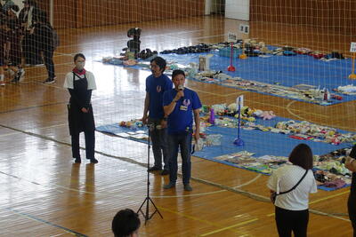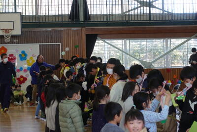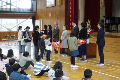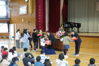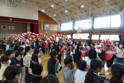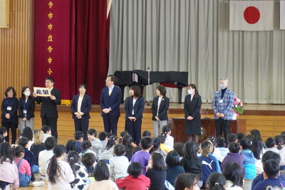 9月13日(金)に7月から今日まで給食の準備や片付けに御協力いただいたボランティア2名の方に感謝の会を開きました。体育館に来ていただき、子供たちからお礼として感謝のことばと花束をお贈りました。