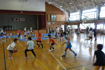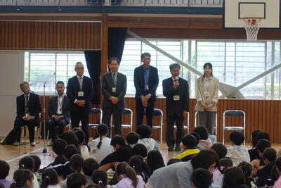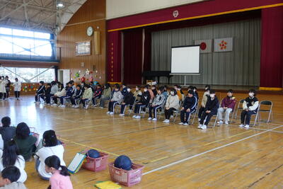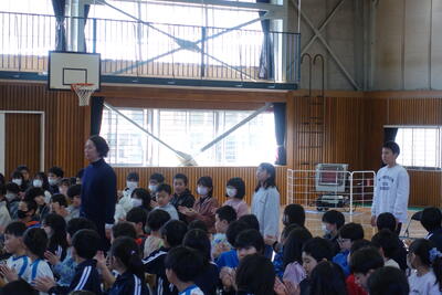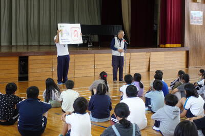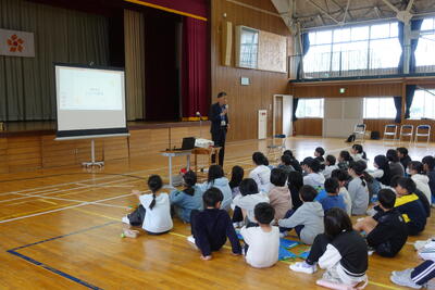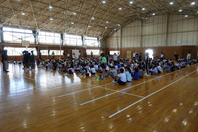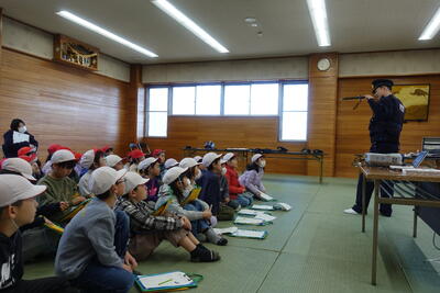 その後、全校生が体育館に集合し、直井様からお話をいただきました。不審者に対しての距離感、手やランドセルをつかまれたときの対応、「いかのおすし」等を丁寧に教えていただきました。校長先生の話では、不審者もそうですが最近報道で話題となっている熊のことも取り上げ、「自分の命は自分で守る」ようにとお話ししてました。