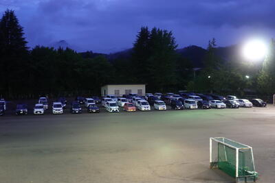 〇整然と並べられた参加者の車           〇運動会の説明(校内放送)の様子