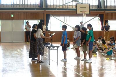 1校時に終業式がありました。子供たちはやはり落ち着いた態度で体育館に入場していました。校長先生の話では、今市小のよいところのあいうえお(あいさつ、歌声、笑顔、思いやり)を話され、2学期もがんばりましょうと子どもたちを労っていました。また、これから始まるパリ・オリンピックで応援のこと(ホッケー女子日本代表に今市小出身者がいるそうです。)、そして、交通事故やけがなどなく2学期に元気な顔を見せてほしいと話されました。