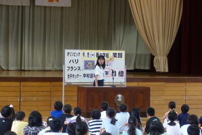 始業式となりました。どの学年も落ち着いた様子で入場し待つことができました。校長先生からは、1学期終業式にお願いしたとおり、けがなく元気にきてくれてうれしいとお話しがありました。また、本校の卒業生でパリオリンピックにフィールドホッケー女子日本代表として参加した中村選手に触れ、あきらめずにがんばってほしいこと、感謝の気持ちを忘れないでほしいこと、目標を決めて過ごしてほしいことを子供たちにお話しされました。