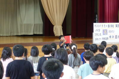 次に、児童代表の3年生と6年生から発表がありました。3年生は1学期に算数の計算、朝の歌、自主学習をがんばったこと、夏休みには宿題を早く終わし家の手伝いをし楽しい夏休みにしたいと発表していました。6年生は1学期に下級生に優しくしたこと、何事にも挑戦したこと、高学年の自覚をもって生活したこと、2学期は最高学年の自覚をもって仲間と協力し生活、行事に取り組みたいと発表していました。2人ともすばらしい発表で発表後に大きな拍手が贈られていました。