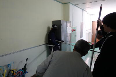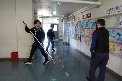 授業中に不審者が校内に入ってきた時のことを想定して訓練を実施しました。緊急放送により、子供たちは各教室のドアにバリケードを築くとともに、ドアのガラスにはカーテン等で教室の中を見えないようにし、教室にいる子供たちの存在を悟られないようにしました。男性教員数名で不審者に対峙し確保する実践を行いました。