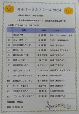 11月15日(土)に「オータムスクール」が開催されました。この事業は、本校の学校運営協議会や地域コーディネーターさんが中心となって開催している活動です。今年もたくさんの方の御協力により、15種類ものアクティビティがそろいました。どれも楽しいものばかりで、参加した子供たちは、時間を忘れて活動に取り組んでいました。