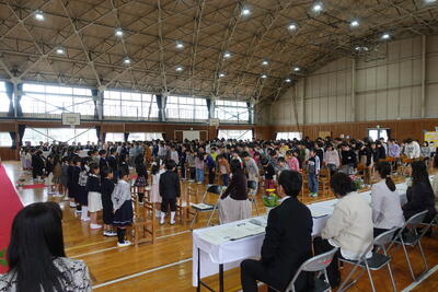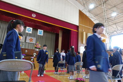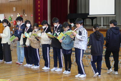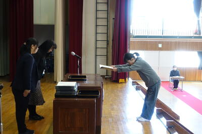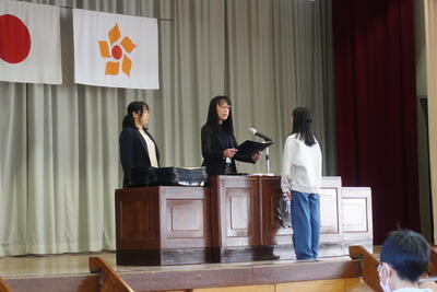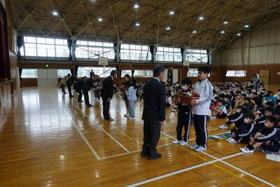その後は、よい歯の図画ポスター・標語、バレーボール部の表彰がありました。名前を呼ばれたら、はっきり返事をし賞状の伝達を受けることができました。