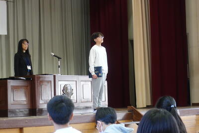 次に、4年生児童の発表がありました。勉強や運動会、持久走大会について発表しました。中でも持久走大会では5位以内に入り、練習をやってよかったと思えるようにがんばりたいと力強く話していました。