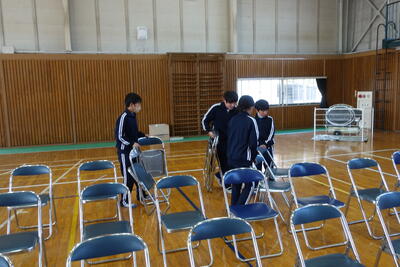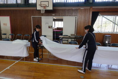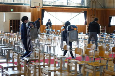 1~4年生は給食終了後下校し、5・6年生、PTA役員、保護者の皆様、ICMおやじの会、職員で準備をしました。多くの方々にお越しいただいたおかげで、短時間で準備が終わりました。