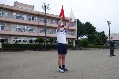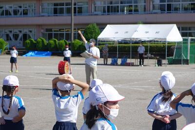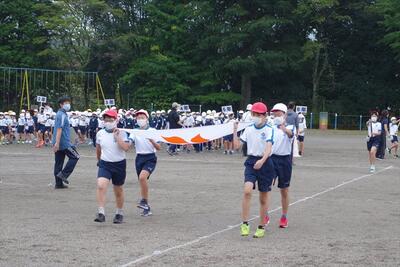 菊池先生、新山先生、八代先生の指導の下、吹奏楽部の演奏により入場行進が堂々とできました。代表児童一人一人の動きが素晴らしく、運動会の始まりにふさわしい引き締まったセレモニーとなりました。