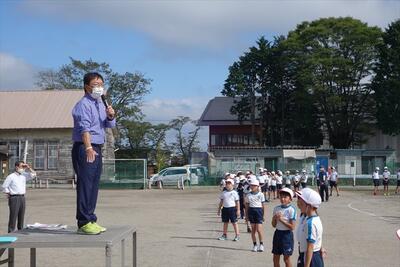 子どもたちを労う石川校長先生 校歌斉唱での指揮