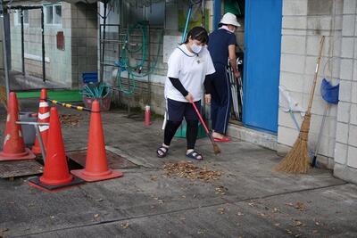 ゴミ出しの様子 大量のゴミ出し終えて記念撮影