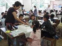 本日5校時に、地域安全会議を開催いたしました。登下校時にJアラートが発令された場合の避難について、児童と保護者の皆様とで話し合いました。各ルートごとに避難場所としてお願いしたい施設や商店などはどこか相談しました。また、子ども110番の家も確認しました。そして、地域安全マップに記入しました。ルートごとの話し合いの後、前庭に一斉下校の隊形で集合し、交通担当の教員から、下校の仕方について説明し、親子で歩いて下校しました。途中、地域安全マップに記入した箇所に「避難場所」として受け入れてくださるようお願いしました。快くお引き受けくださいました。保護者の皆様が多数参加してくださり、心強く思います。避難場所として施設や商店などの皆様が多数御協力くださいました。地域の皆様に心より感謝申し上げます。保護者の皆様、地域の皆様に大切にしていただき、子ども達の安全を守ることができます。
