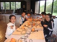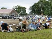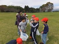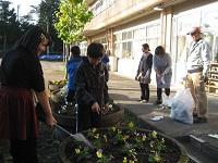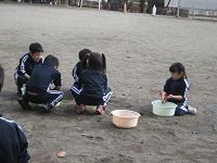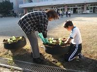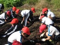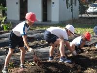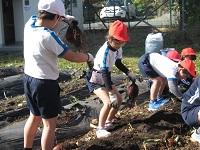 1年生が入学して初めてのさつまいもほりをしました。「ワァワァ、キャーキャー」と大騒ぎで、とても楽しそうでした。1本のつるにさつまいもが3本ついているのに驚いている子がいました。「おうちに持って帰って食べよう」とつぶやく子もいました。「またやりたい」という声に、教員が「来年やろうね」と答えると、「えー、ずいぶん先だね。」という子もいました。初めてのさいもほりはとても楽しかったようです。作物を収穫した後は、落ち葉やぬかを入れて土作りをします。去年よりミミズも増えたような・・・。おいしい作物をつくるため、子ども達のため、今から土作りに励む職員がいます。毎年使っている畑ですが、土が以前よりよくなりました。来年も楽しみです。