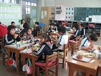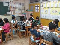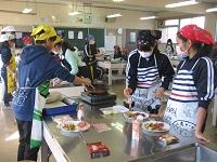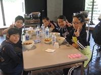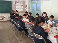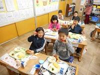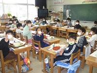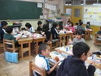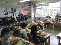 ランチルーム会食は9班でした。台風で臨時休業になり、延期になっていた班です。上級生と下級生が同じテーブルで食事をします。献立は「鮭ネギ味噌焼き、ほうれん草のごま和え、沢煮椀、カスタードプリン」です。全て完食した子や上手に三角食べをしている子、ごま和えをおかわりしている子など、会食を楽しみながら食事をしている様子もうれしいものでした。片付けは上級生が中心になって行います。上級生の頼もしさもうれしいひとときです。