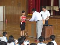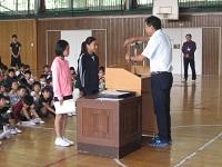 広場の時間に朝会を行いました。はじめに表彰(伝達)を行いました。今回はたくさんありました。校内読書感想文コンクール、地域安全マップ、青少年読書感想文コンクール、上都賀北部地区小中学校作品展、下野教育書道、絵で伝えようわたしの町のたからもの絵画展、花火大会の絵コンクール、読書がんばり賞、人権作文・人権絵画、日光市教育祭、日光市模範児童表彰、卓球全国大会、SL大樹に手をふろうポスター絵画展、全国小学校管楽器合奏フェスティバル、今市ブロック陸上大会、校内持久走大会などです。文化・芸術・スポーツ分野で、子ども達ががんばったことは、とてもうれしいことです。多くの子ども達が今一番輝きました。